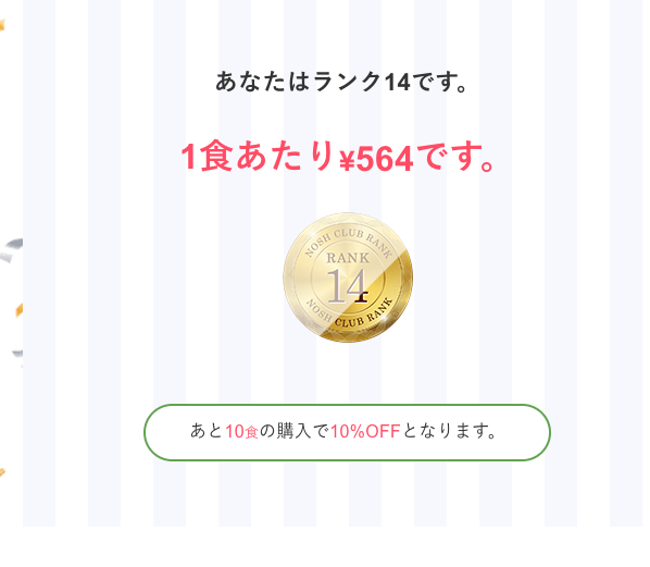 実際に私(ランク14・20食プラン・3週に1回注文)が払っている実質単価は 約640円/食 です。