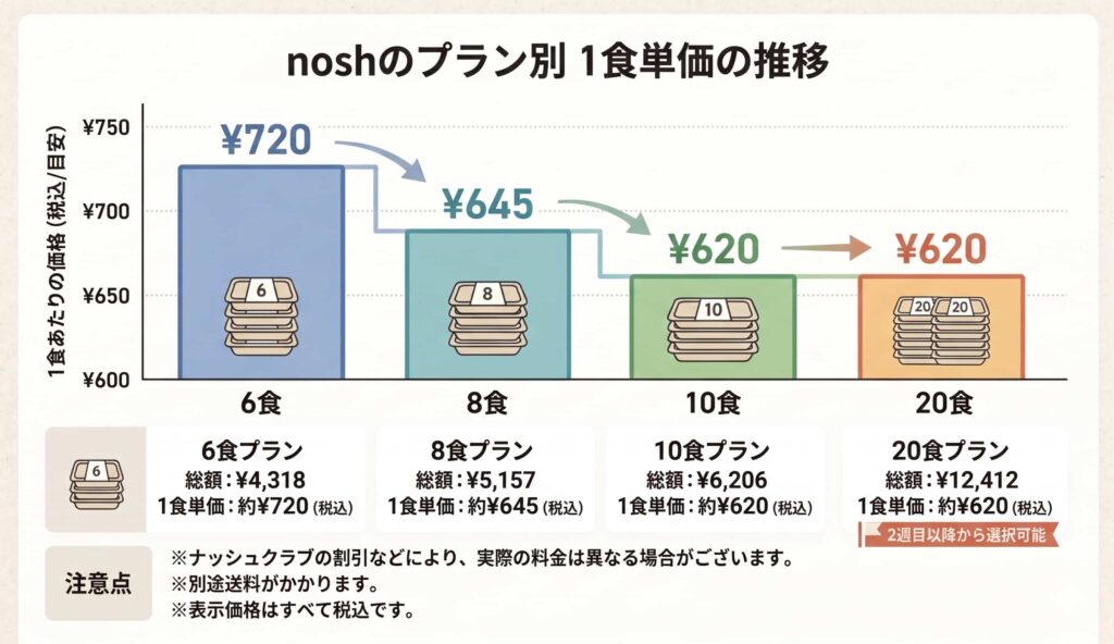 ナッシュは注文食数が多いほど1食単価が下mがる仕組みです。