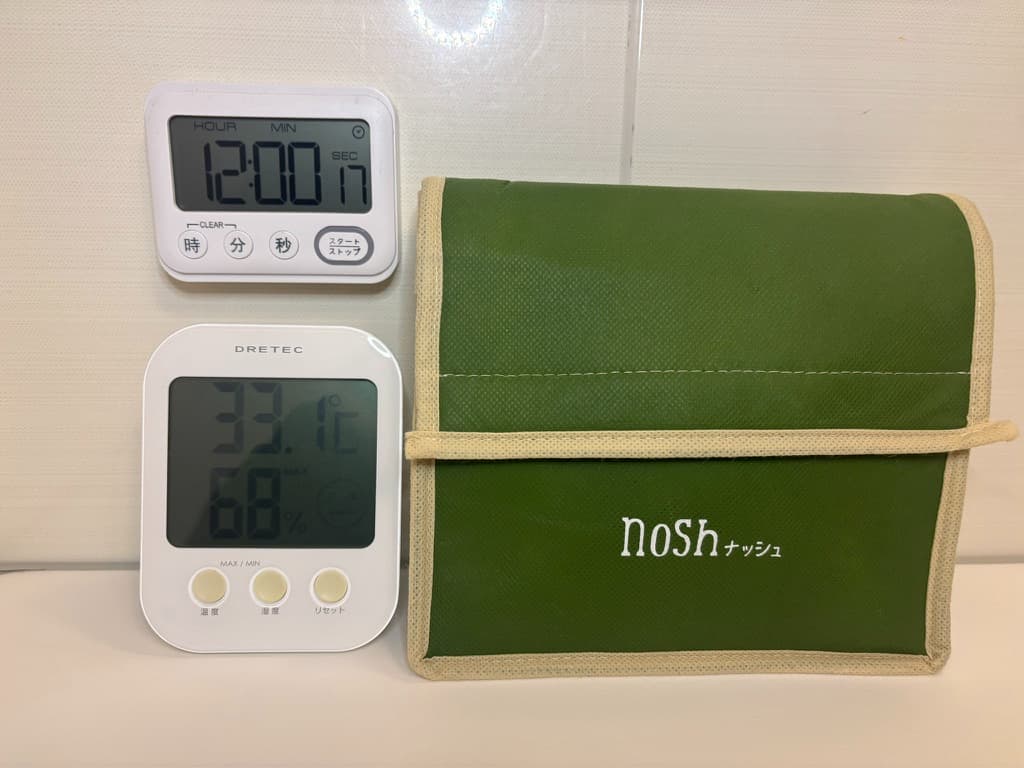 保冷バッグに冷凍のままナッシュを入れて、通勤時間を再現。