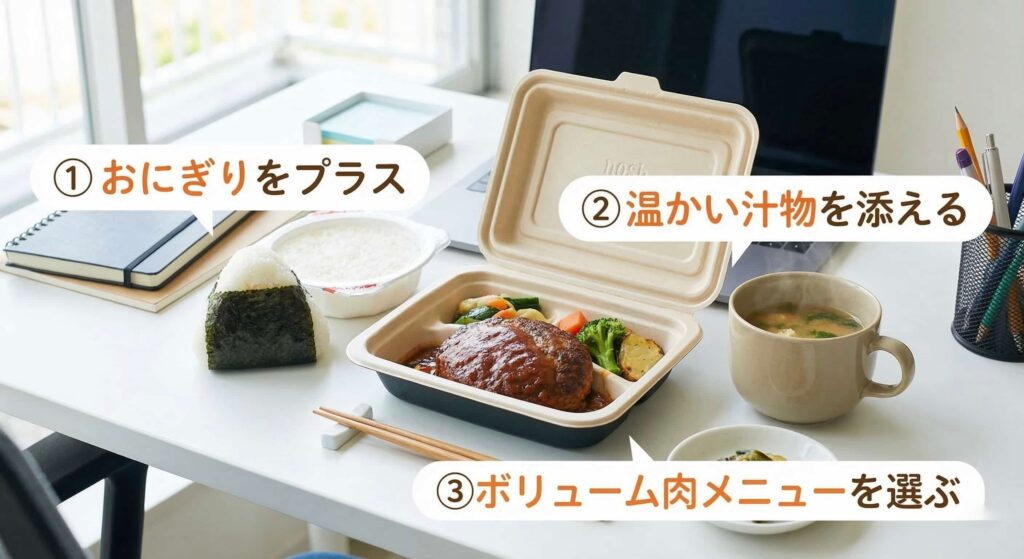 プラス料金で、通常メニューより増量された「ボリュームアップ」も選べるので、午後のプレゼンやハードな仕事がある日は、自分へのご褒美にこれを選ぶのも賢い選択ですよ!