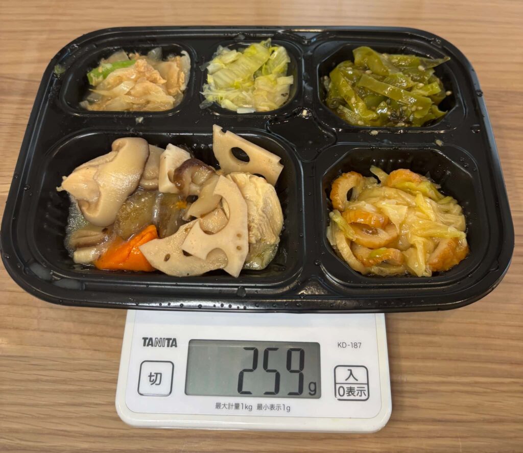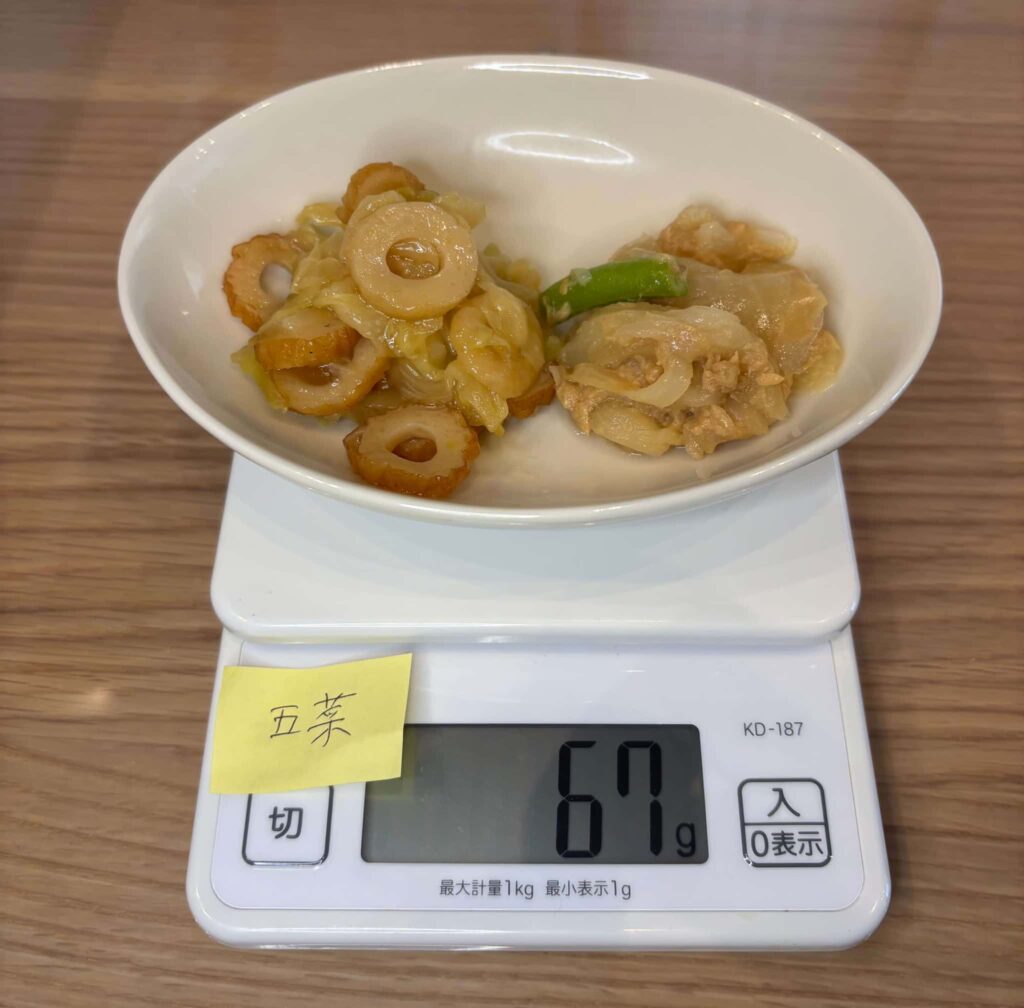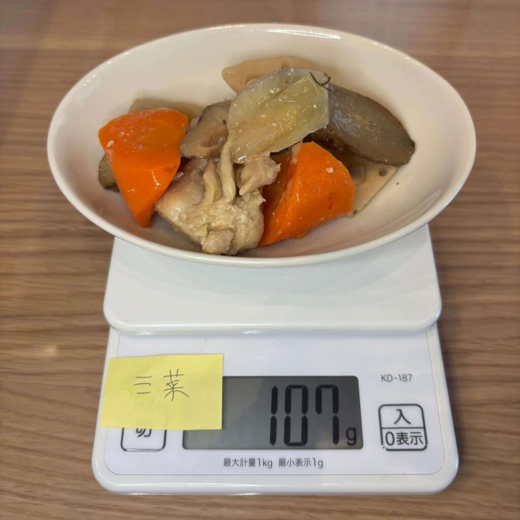 主菜の筑前煮をそれぞれ取り分けて計量してみたところ、三菜が107g、五菜が101gでした(お皿除いた実測値)。