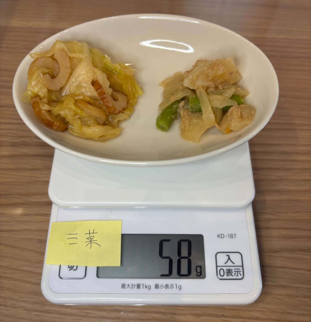 共通の副菜(キャベツとちくわの甘辛炒め、玉ねぎとインゲンのツナサラダ)は三菜58g、五菜67g。