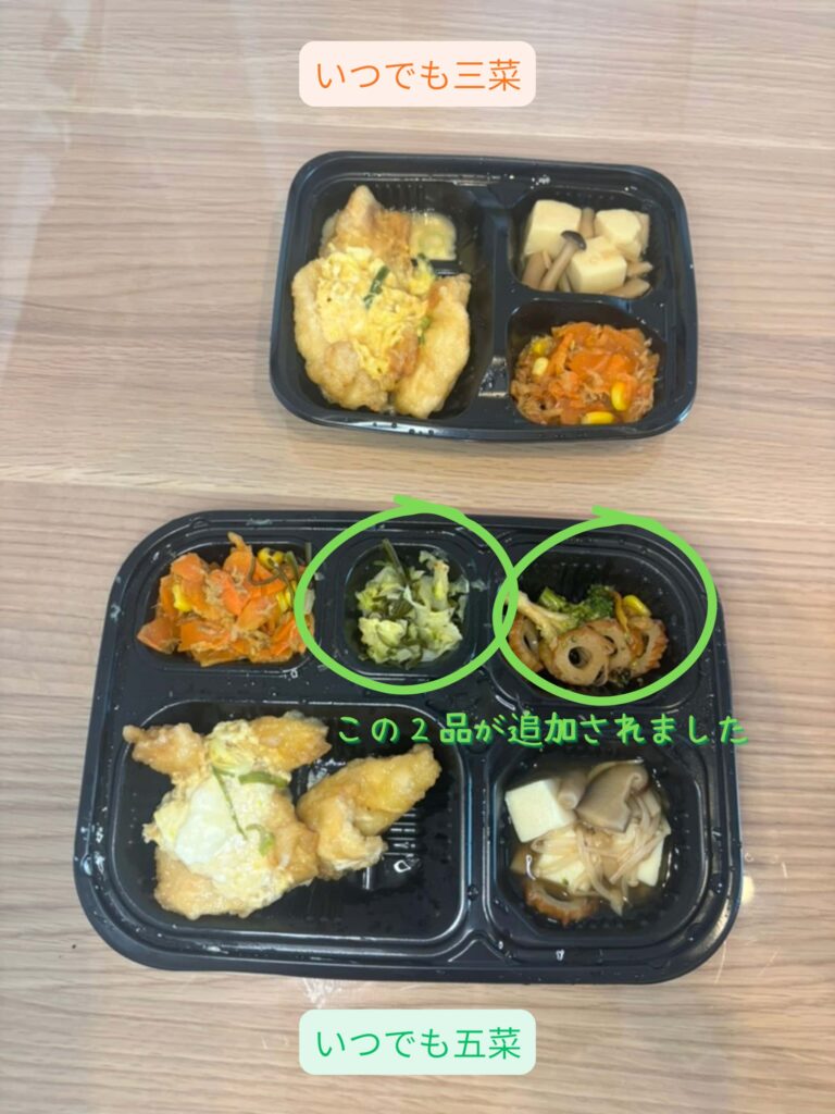 - 三菜・五菜ともに主菜の量はほぼ同じ
