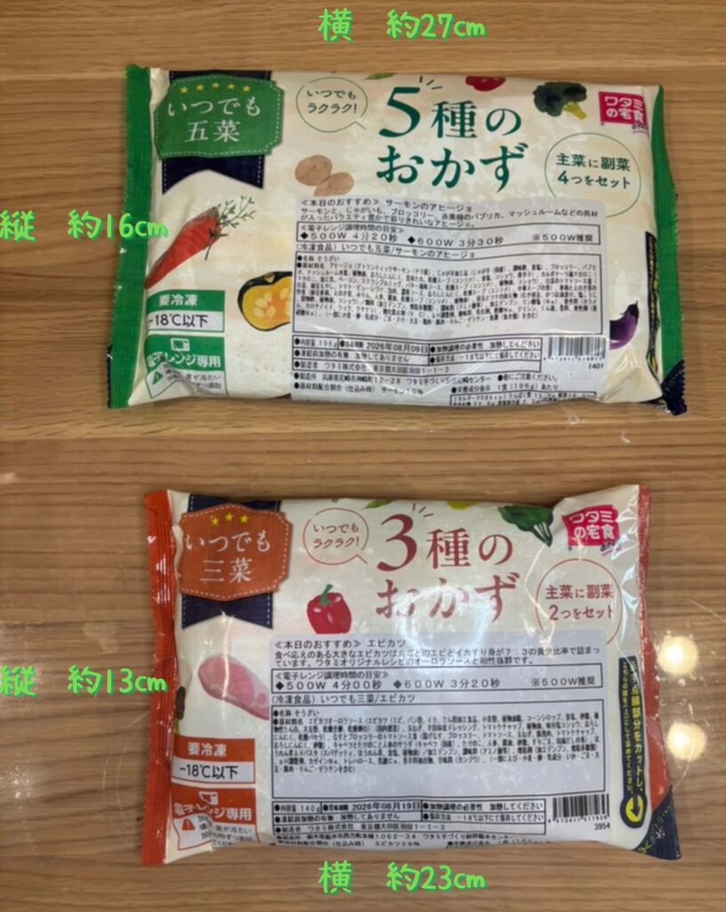 ところが「いつでも五菜」は一回り大きく、実際に並べてみると幅が一回り大きくなっており、冷凍庫の棚の仕切りによっては「三菜はスッと入るのに五菜は引っかかる」というケースもありそうです。